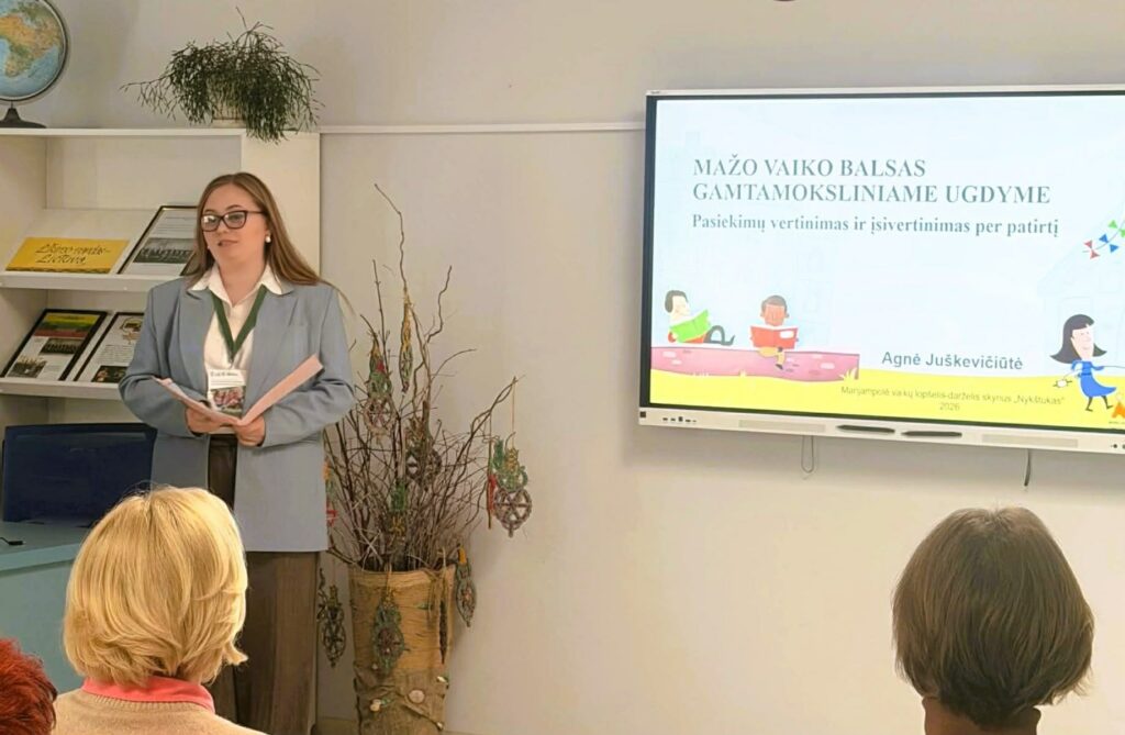 Renginio metu abi pedagogės pristatė savo praktinę patirtį ikimokyklinio ugdymo srityje. Virginija Pajaujienė skaitė pranešimą „Žalioji tyrinėjimų erdvė“, kuriame atskleidė ugdymo aplinkos kūrimo svarbą, skatinančią vaikų smalsumą, tyrinėjimą ir pažinimą per patirtį. Agnė Juškevičiūtė pristatė pranešimą „Mažo vaiko balsas gamtamoksliniame ugdyme: pasiekimų vertinimas ir įsivertinimas per patirtį“, akcentuodama vaiko aktyvų įsitraukimą, refleksiją bei vertinimo procesus.